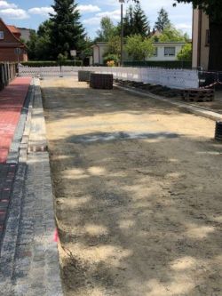 Wie unschwer auf dem Fotos erkennbar ist: der Gehweg ist gepflastert, die Borde gesetzt und der Unterbau eingebracht. Und: alles laut Plan! Das ist eine großartige Leistung, die wir hier auch besonders hervorheben und würdigen möchten.