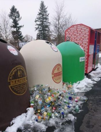 Um einen derartigen Anblick zukünftig zu vermeiden nehmen Sie Ihr Glas bitte wieder mit nach Hause und stellen es nicht einfach rings um die Container ab. Danke schön.