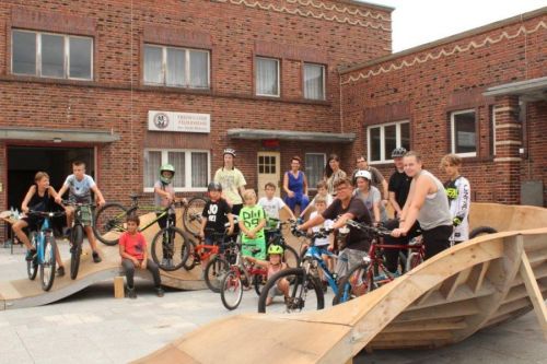 Highlight dieses Workshops war zweifelsohne die Errichtung eines mobilen Trainingsparcours aus Holz auf dem Welzower Marktplatz. Auf diesem sogenannten "Pumptrack" konnte jeder mit dem eigenen Mountainbike selbst seine Runden drehen und dabei sich selbst und seine Fähigkeiten ausprobieren.
