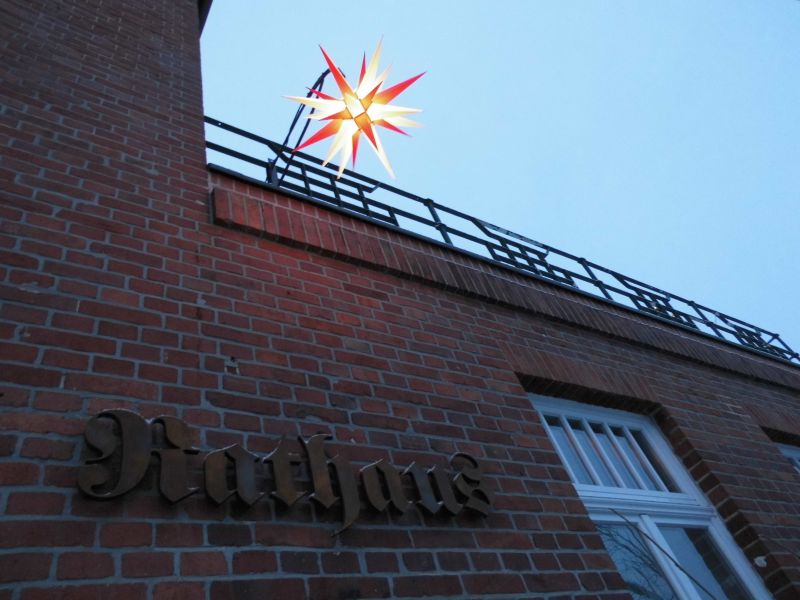 Der beleuchtete Herrnhuter Stern über dem Eingang des Welzower Rathauses
